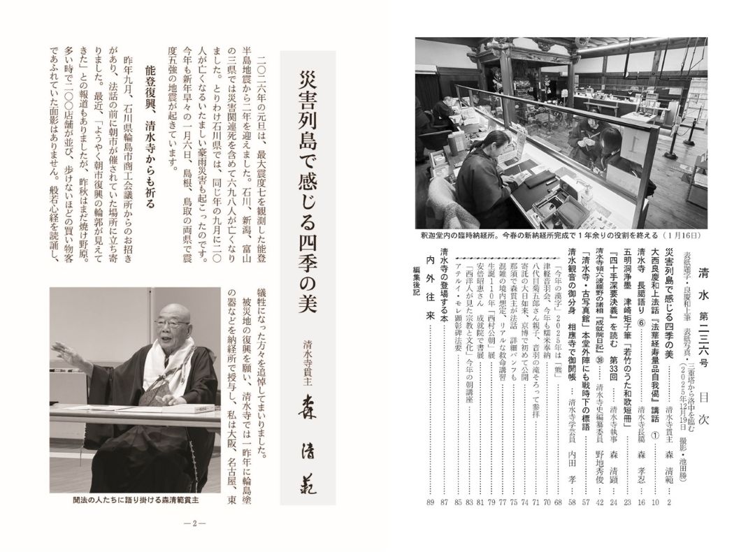 巻頭のお話は、森貫主による『災害列島で感じる四季の美』。また、恒例の年中行事のほか、八代目を襲名された尾上菊五郎さんが親子そろって清水寺を参拝された時の様など、2025年の10月から2026年1月までの清水寺を写真で紹介。前号から続く大西良慶和上法話や清水寺長臈語りのほか、学芸員による当山所蔵品や歴史の解説など読みごたえたっぷりです。