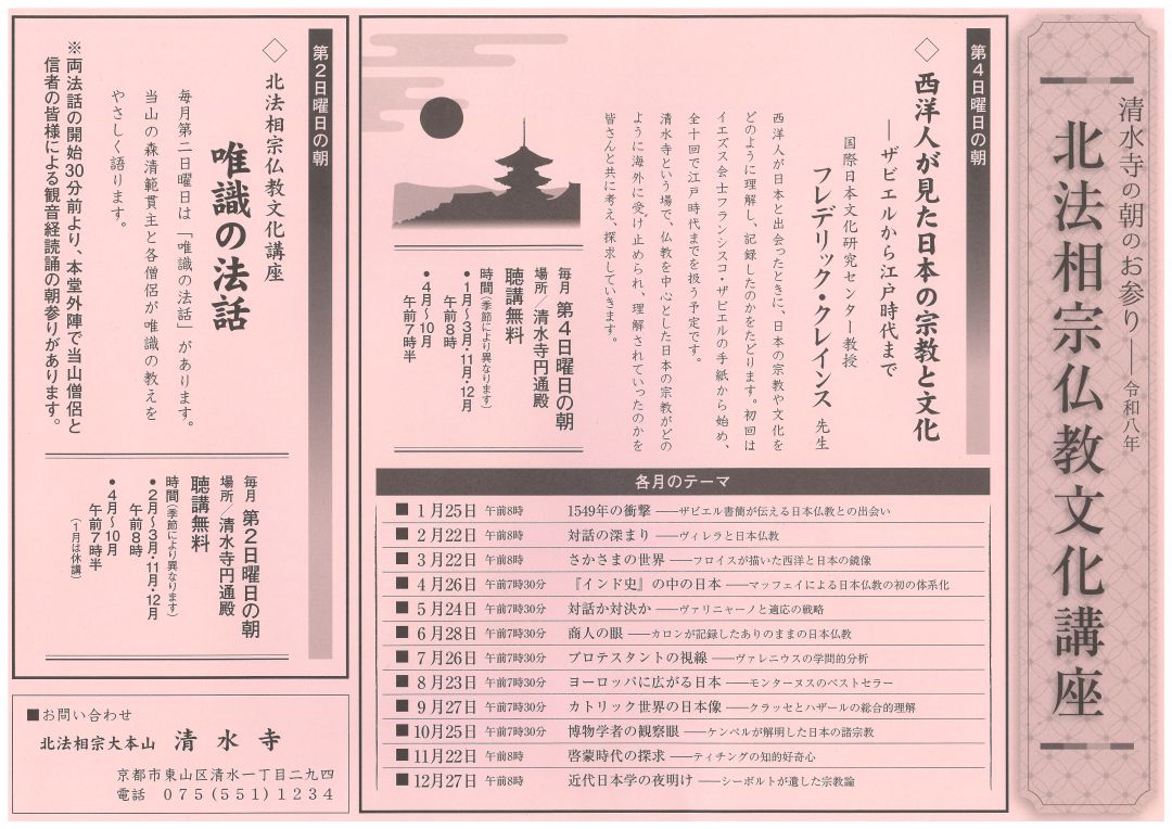 西洋人が日本と出会ったときに、日本の宗教や文化をどのように理解し、記録したのかをたどります。初回はイエズス会士フランシスコ・ザビエルの手紙から始め、全十回で江戸時代までを扱う予定です。清水寺という場で、仏教を中心とした日本の宗教がどのように海外に受け止められ、理解されていっったのかをみなさんとともに考え探求していきます。