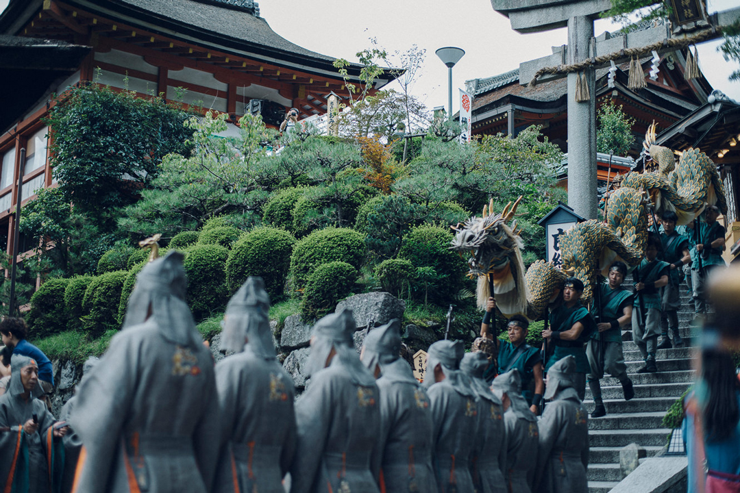 年に2度、春と秋だけの行事で、全長10メートルを超える青龍と四天王、夜叉神、十六善神といった様々な装束の一行が、境内と門前町を練り歩きます。迫力ある青龍の姿と凝った衣裳もみどころの一つ。ワダエミ先生のデザインにより、京都の伝統工芸の職人さんの技術の粋を集めて創られました。青龍を通して観音さまとのご縁を結んでいただければ幸いです。