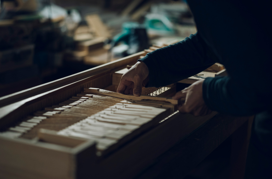「清水の舞台」の床材として多くのお参りの方をお迎えしてきた檜の板は、音楽家、調律師でありクラヴィコード制作者の内田輝氏によって、約1年をかけて「クラヴィコード」という14世紀に発明された西洋の鍵盤楽器に生まれ変わりました。
